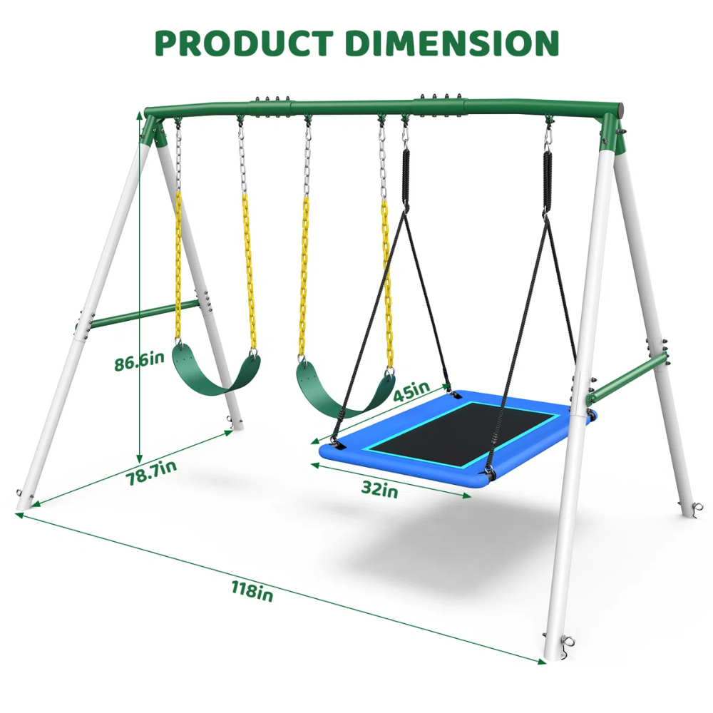 This heavy-duty metal swing set is designed for backyard use, offering strength, variety, and safety. With a total weight capacity of 660 lbs, it includes a large platform (saucer-style) swing and two belt swings, allowing multiple children to swing at once. Its steel frame is built to endure regular use and outdoor weather conditions.