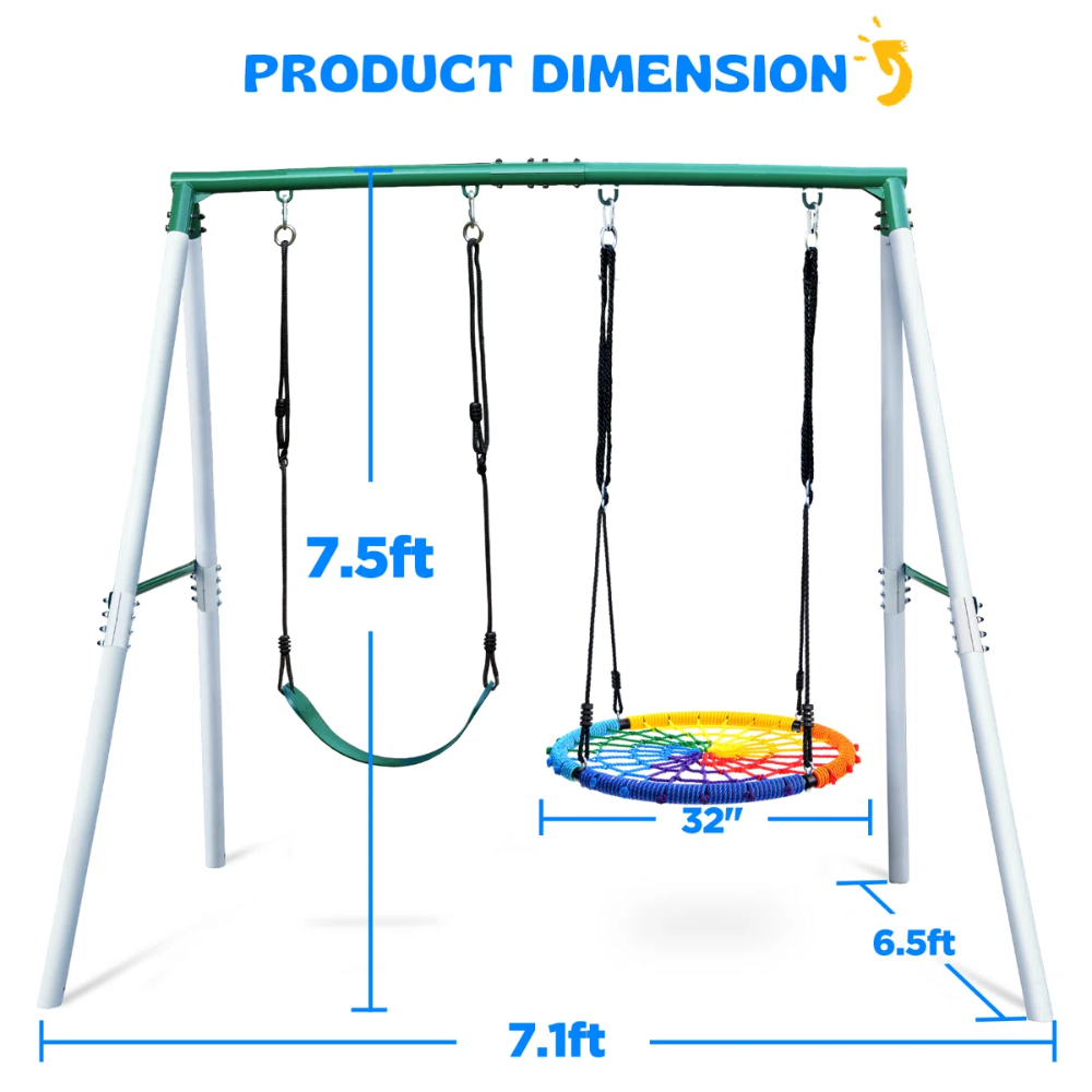 This swing set is built to provide high‑swinging fun for both children and adults. The “7.5′ tall” frame allows more clearance and bigger swing arcs. It includes two different types of swings and is designed for durability and safety.