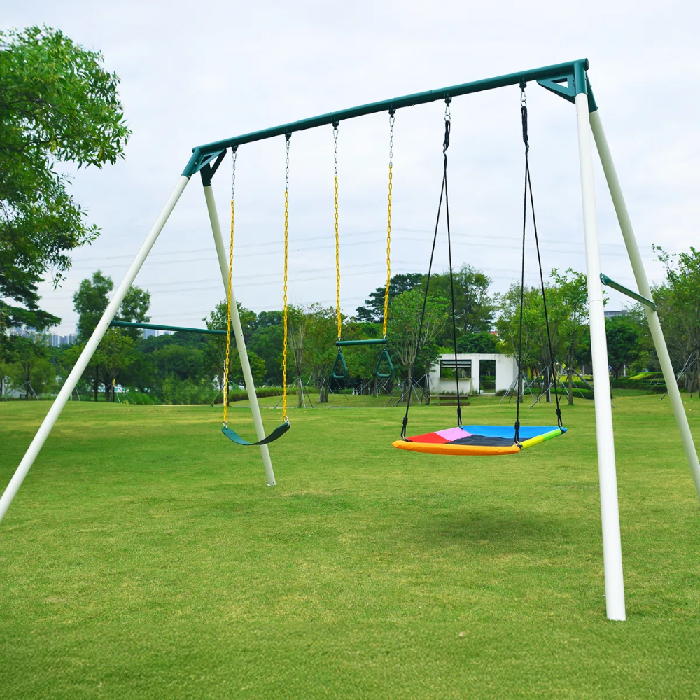 This swing set is built for durability and versatile play. With a metal frame and included belt swing plus a trapeze bar, it offers classic swing fun with some extra acrobatic ability. The height and materials are engineered to accommodate both children and light adults safely.