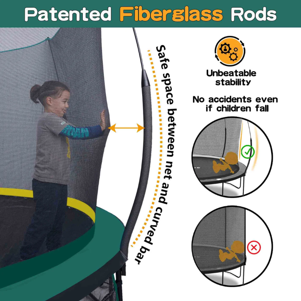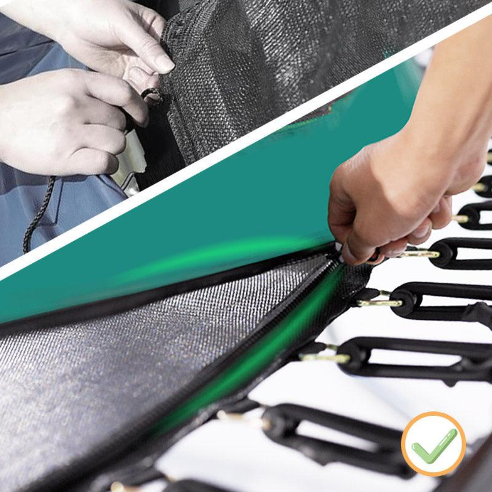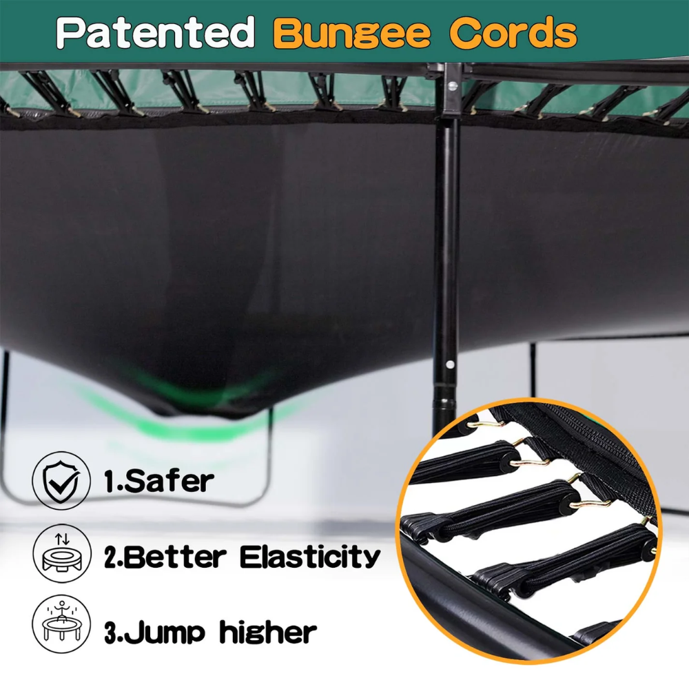 Replaces metal springs with high-tension bungee cords to eliminate pinch points and sharp edges, providing a smoother, safer bounce. - No-Gap Safety Net Design