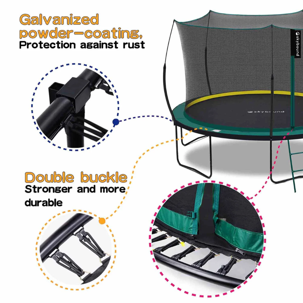 The jump mat is fully sealed to the enclosure net, ensuring there are no dangerous gaps where feet or limbs could slip through. - Durable Frame & Components